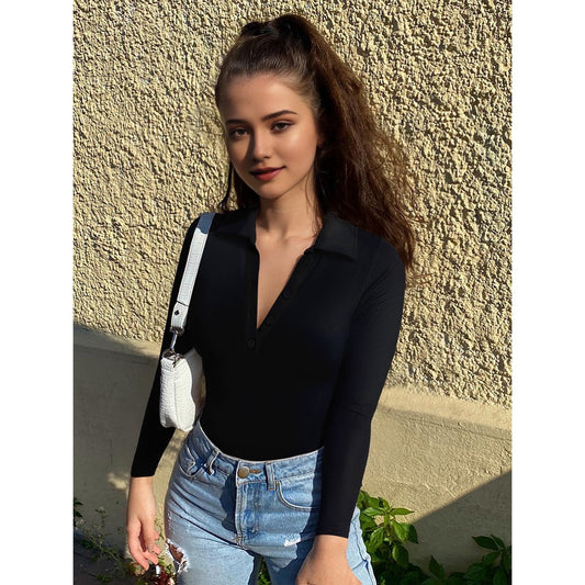 LinenMarket Round Neck Long Sleeve Bodysuit Fitted Womens Tops