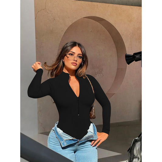 LinenMarket Mock Turtle Neck Zip Up Long Sleeve Bodysuit Deep V Sexy Womens Tops